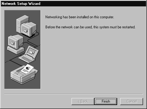 This Network Setup Wizard above is the final screen shown as you finish installing NT 4.0. It is also the first screen you get when bringing up the Network icon under Control Panel to begin installing Network components.